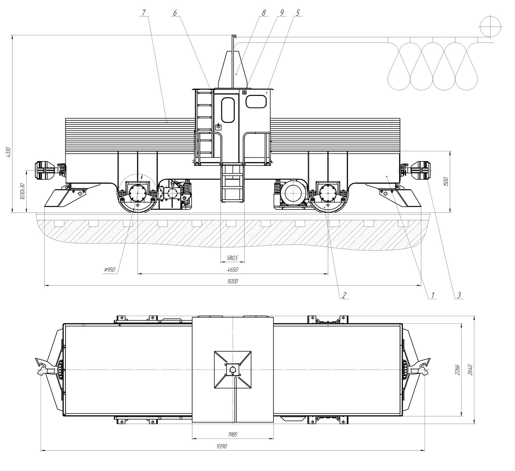 Управление; Управление вагонотолкателем от стационарного пульта расположенного в помещении управлении погрузки, по радиоканалу, максимальное расстояние до вагонотолкателя 1000 метров и по переносному пульту управления с радиусом действия 50 м.